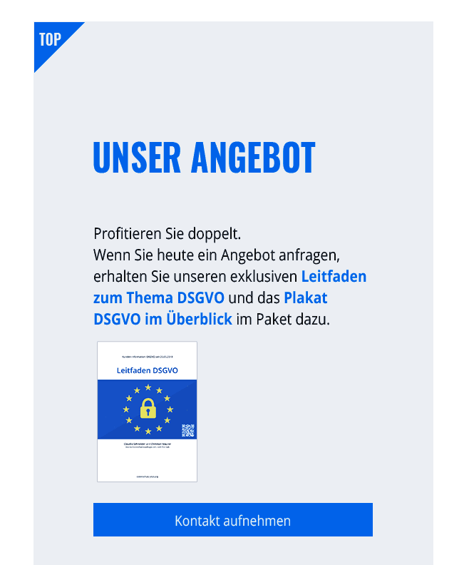 *Konkretes Angebot gewünscht? Nehmen sie Kontakt mit uns auf. Alle Preise verstehen sich netto zzgl. gesetzlicher MwSt. Zusätzliche Kosten sind u.a. abhängig von der Anzahl der Mitarbeiter, Anzahl datenverarbeitender Tätigkeiten, Anzahl der Verträge zur Auftragsdatenverarbeitung, die Anzahl der Quartals- und Jahresberichte oder Anzahl der Schulungen.